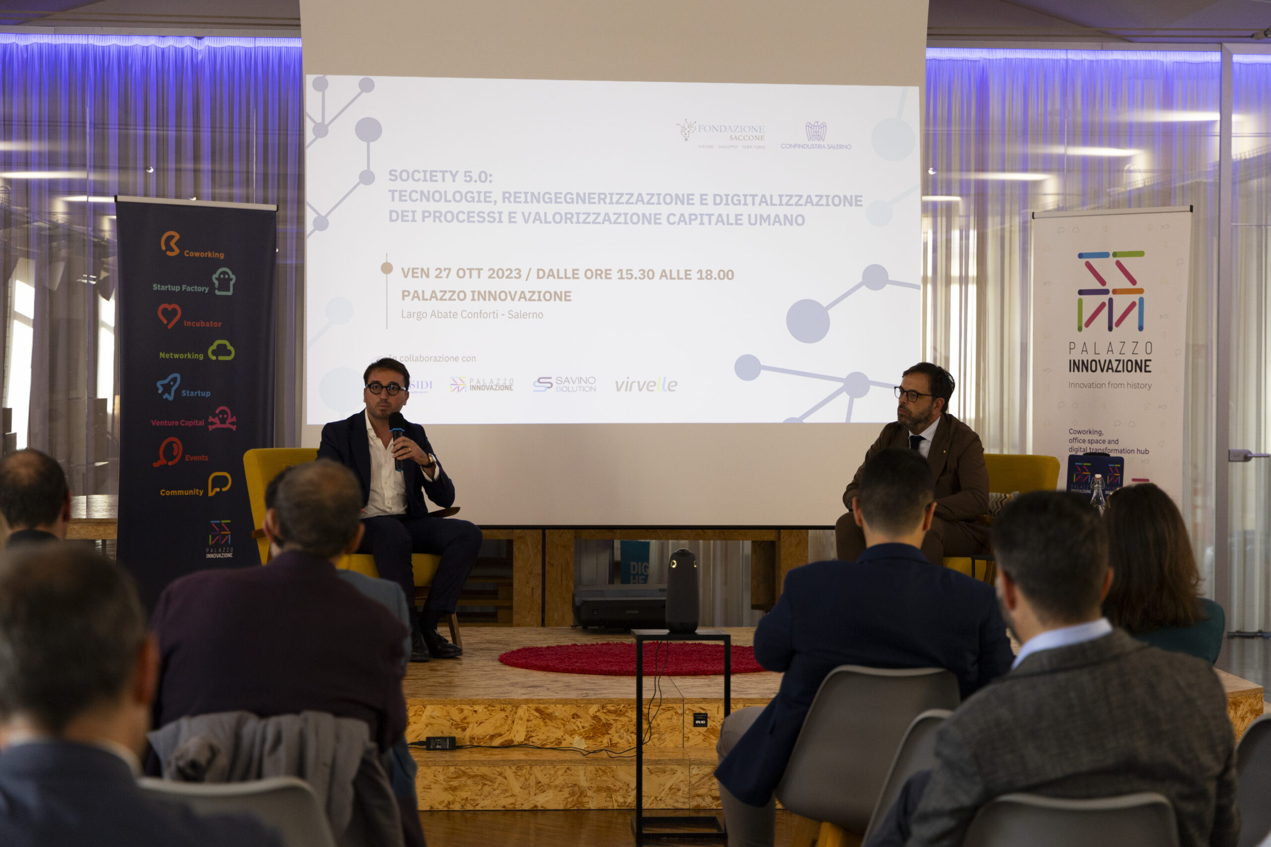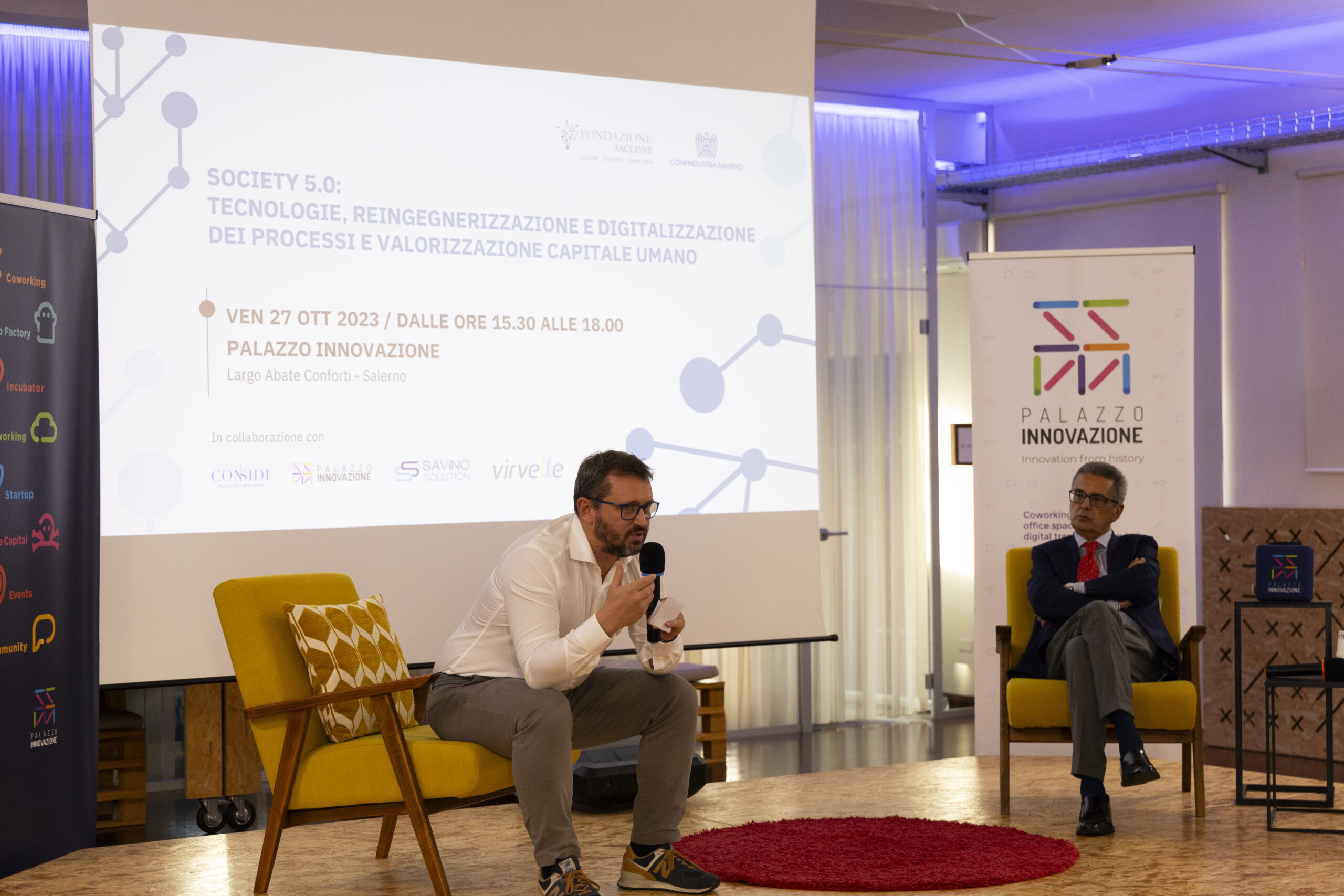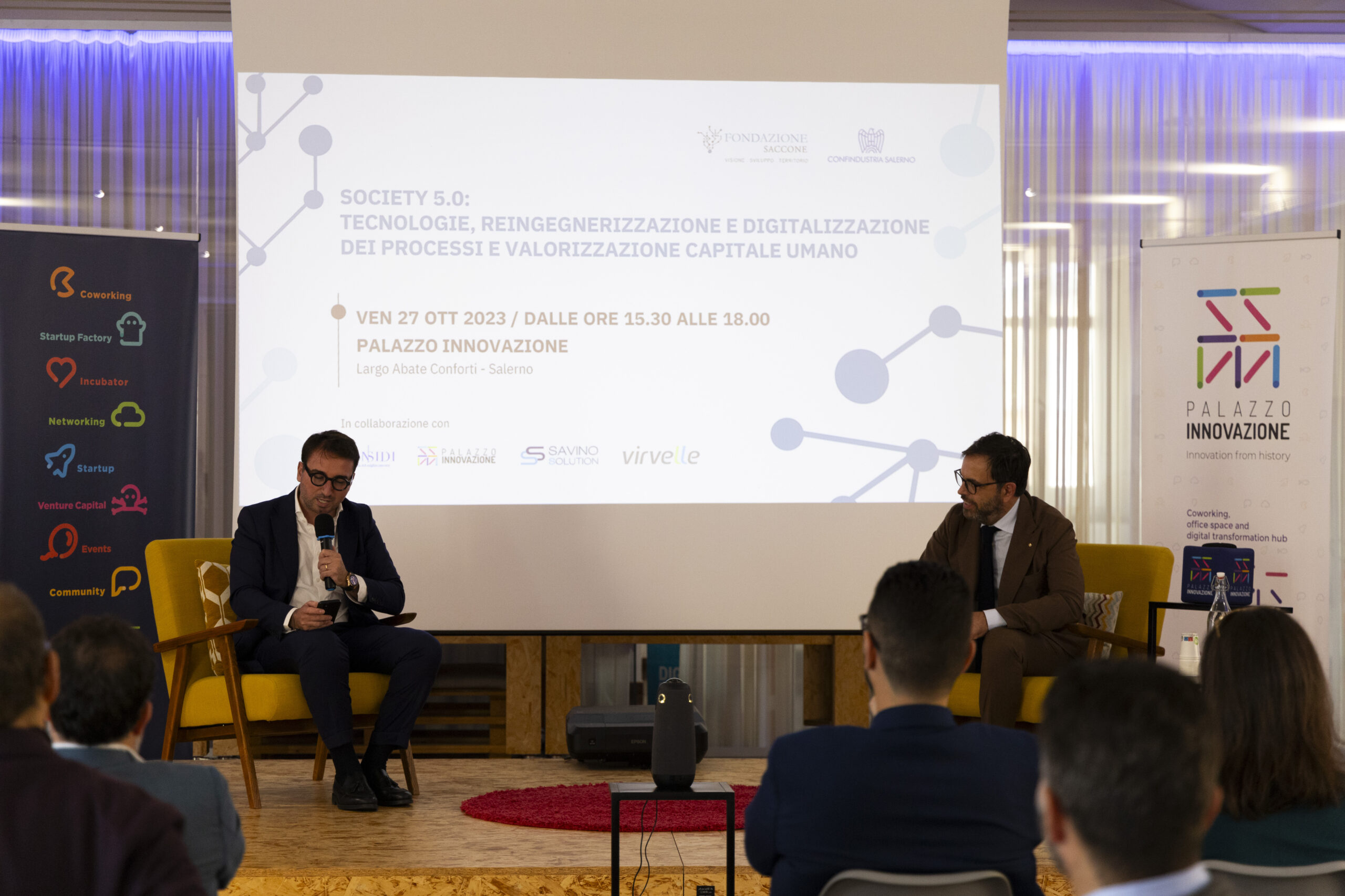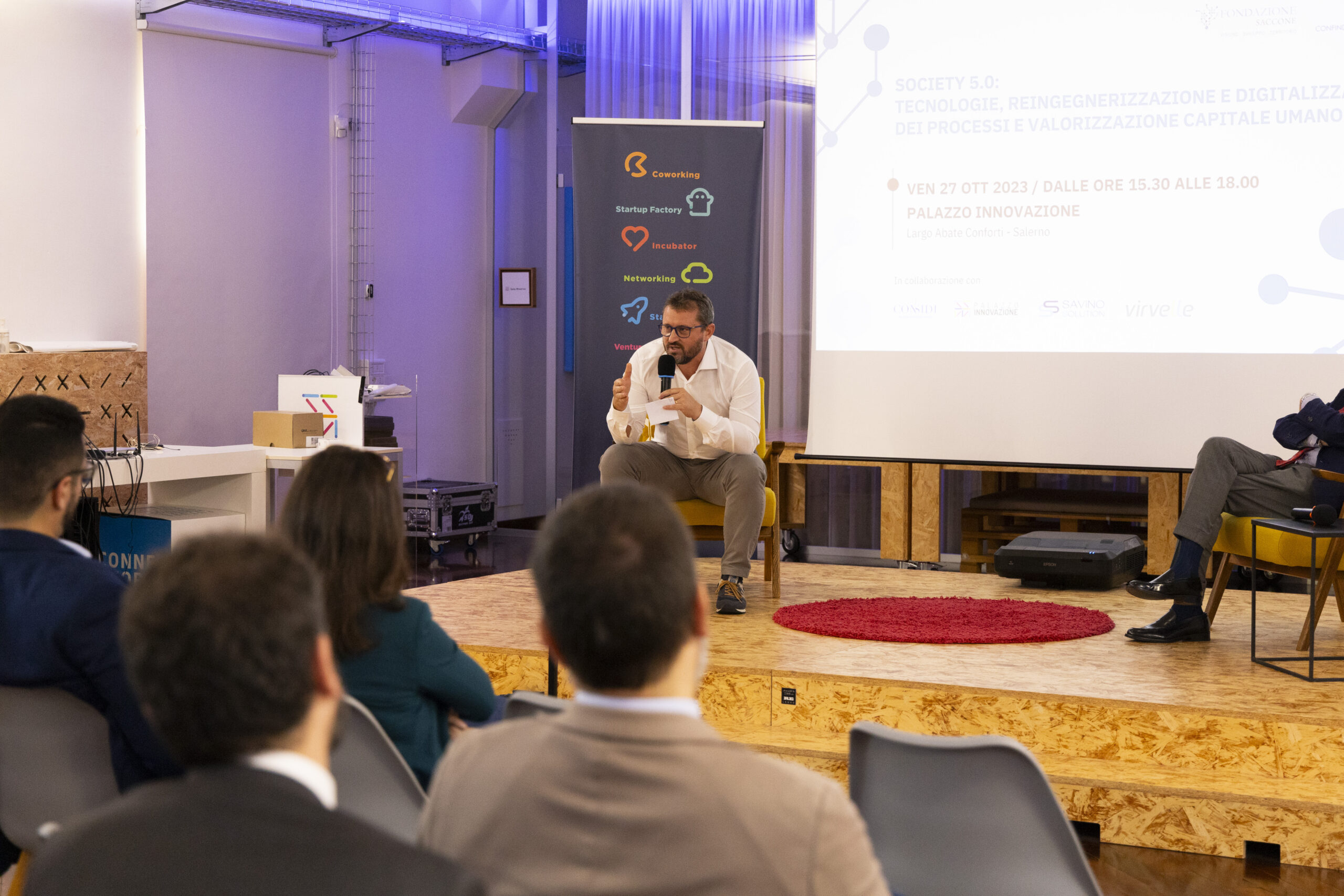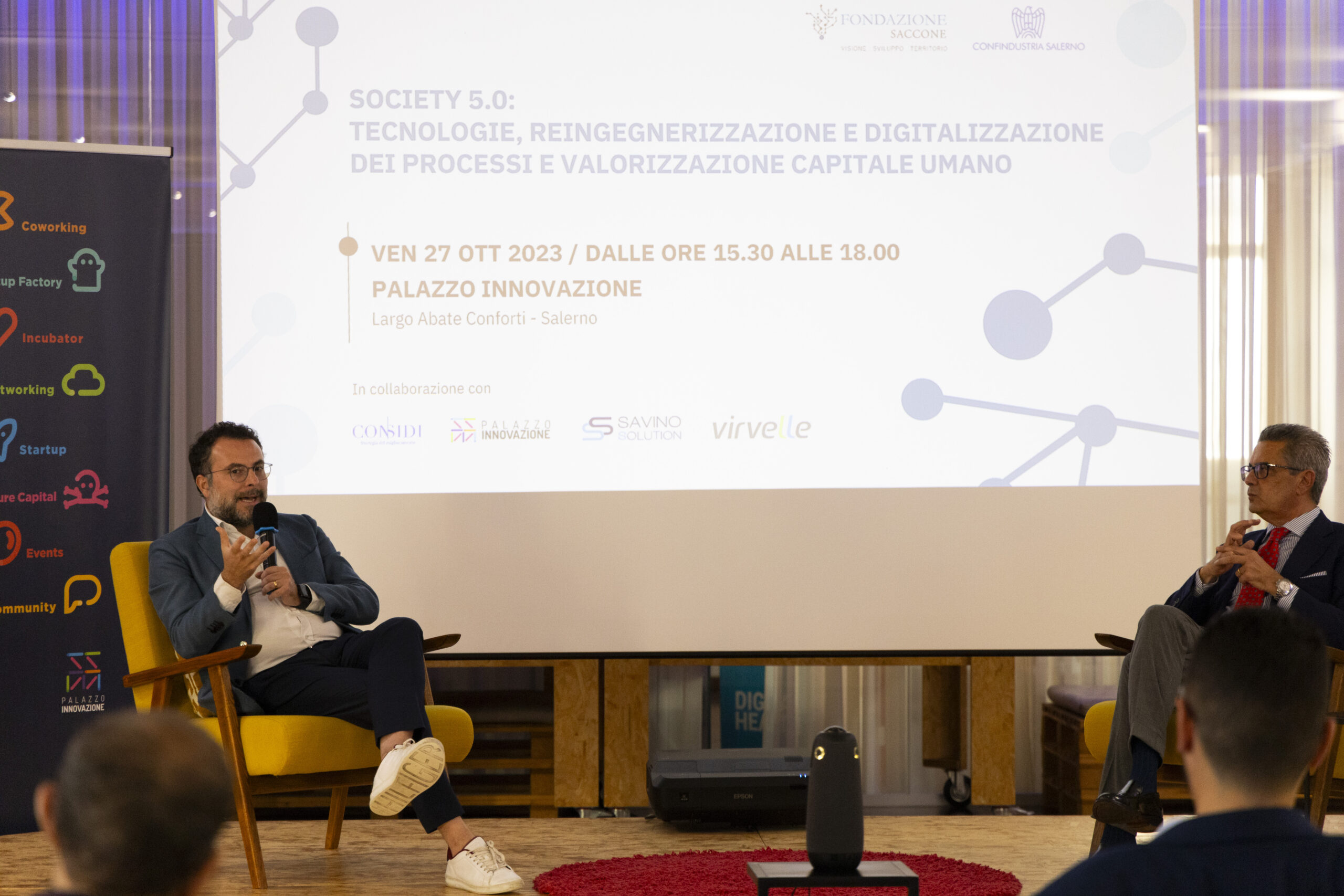 Society 5.0: tecnologie, reingegnerizzazione e digitalizzazione dei processi e valorizzazione capitale umano”. Ecco gli scatti della seconda tappa del Digital Meet 2023, organizzato dalla Fondazione Saccone a Palazzo Innovazione. Un importante momento di confronto con esperti sul tema della digitalizzazione. Sono intervenuti nel corso dell’appuntamento: – Giorgio Scala, Presidente Fondazione Saccone e Responsabile 012Salerno sede territoriale di 012factory; – Edoardo Gisolfi Coordinatore Comitato Tecnico-Scientifico Fondazione Saccone; – Marco Gambardella Vicepresidente Confindustria Salerno con delega alla Digitalizzazione Interventi; – Alessia Saggese Dip. di Ingegneria dell’Informazione ed Elettrica e Matematica Applicata (DIEM); – Nicola Savino – Il Digitalizzatore CEO di Savino Solution SpA Società Benefit; – Mario Vitolo CEO Palazzo Innovazione e General Manager Virvelle; – testimonianza di una buona prassi di Antonio Pallavicino Direttore Operativo CO.ME.P. Srl.