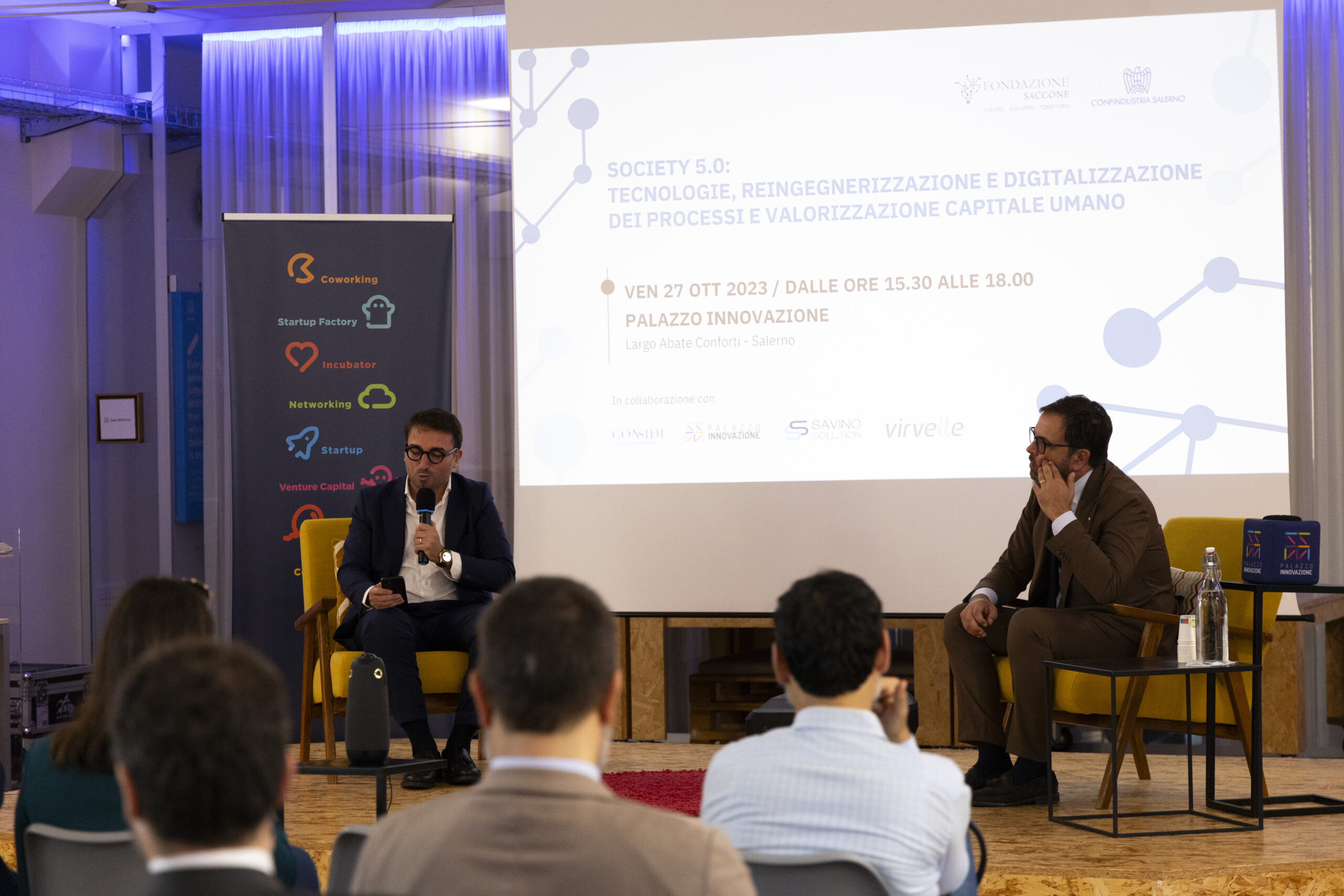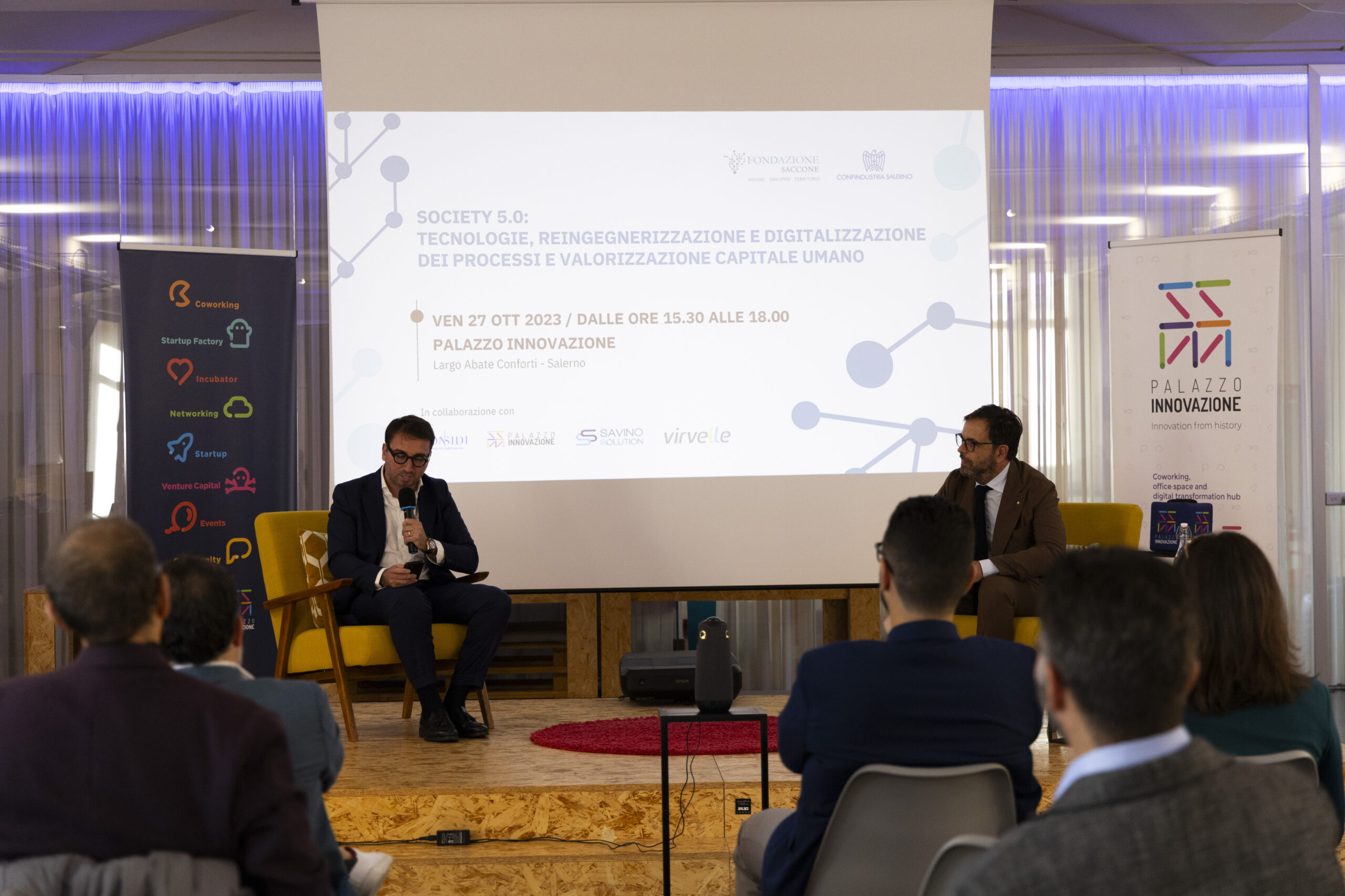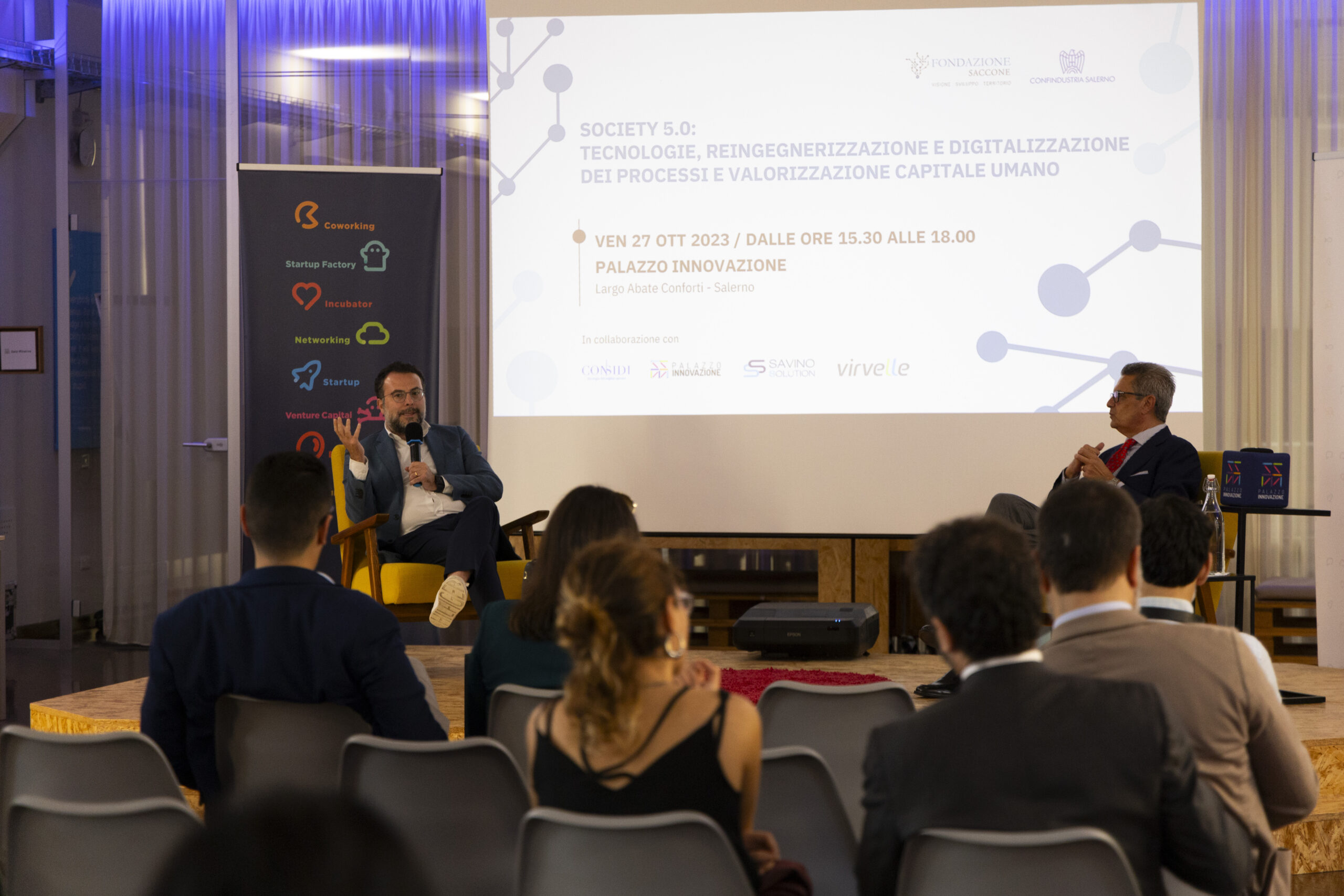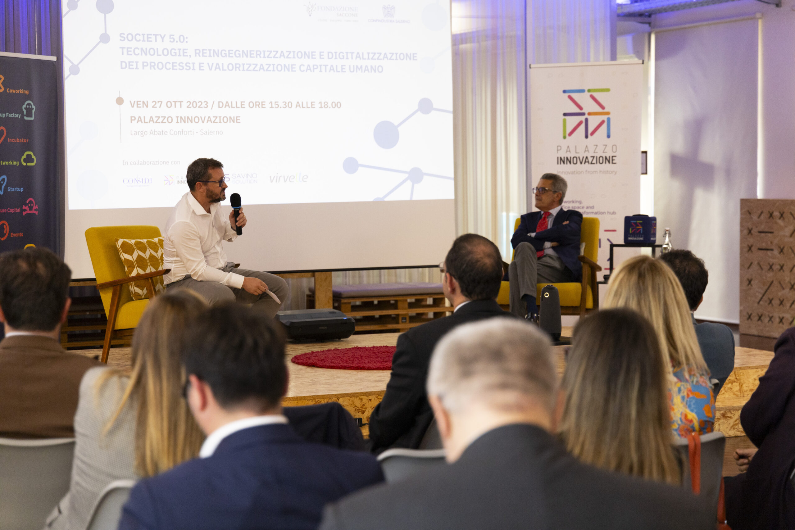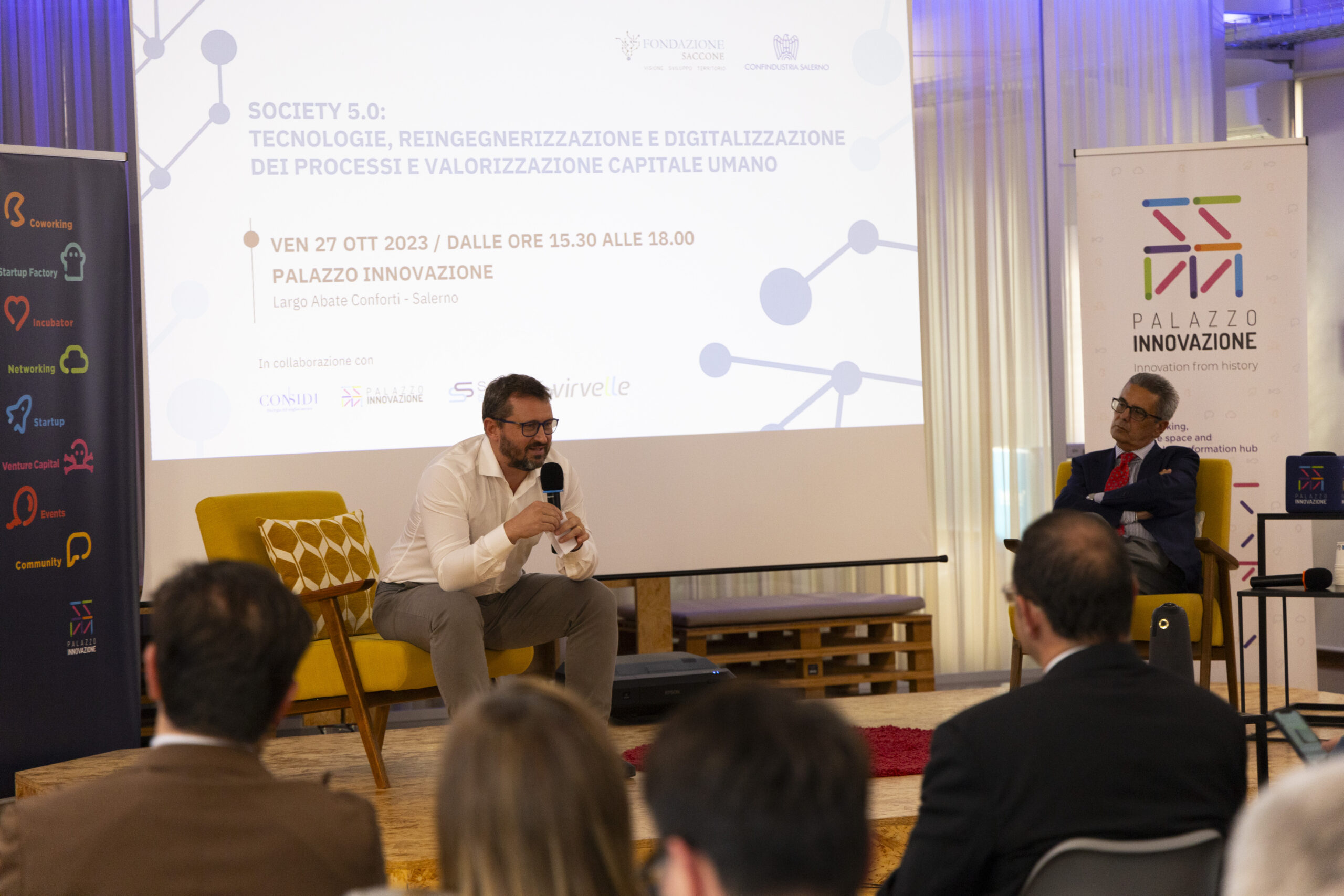Society 5.0: tecnologie, reingegnerizzazione e digitalizzazione dei processi e valorizzazione capitale umano”. Ecco gli scatti della seconda tappa del Digital Meet 2023, organizzato dalla Fondazione Saccone a Palazzo Innovazione. Un importante momento di confronto con esperti sul tema della digitalizzazione. Sono intervenuti nel corso dell’appuntamento: – Giorgio Scala, Presidente Fondazione Saccone e Responsabile 012Salerno sede territoriale di 012factory; – Edoardo Gisolfi Coordinatore Comitato Tecnico-Scientifico Fondazione Saccone; – Marco Gambardella Vicepresidente Confindustria Salerno con delega alla Digitalizzazione Interventi; – Alessia Saggese Dip. di Ingegneria dell’Informazione ed Elettrica e Matematica Applicata (DIEM); – Nicola Savino – Il Digitalizzatore CEO di Savino Solution SpA Società Benefit; – Mario Vitolo CEO Palazzo Innovazione e General Manager Virvelle; – testimonianza di una buona prassi di Antonio Pallavicino Direttore Operativo CO.ME.P. Srl.