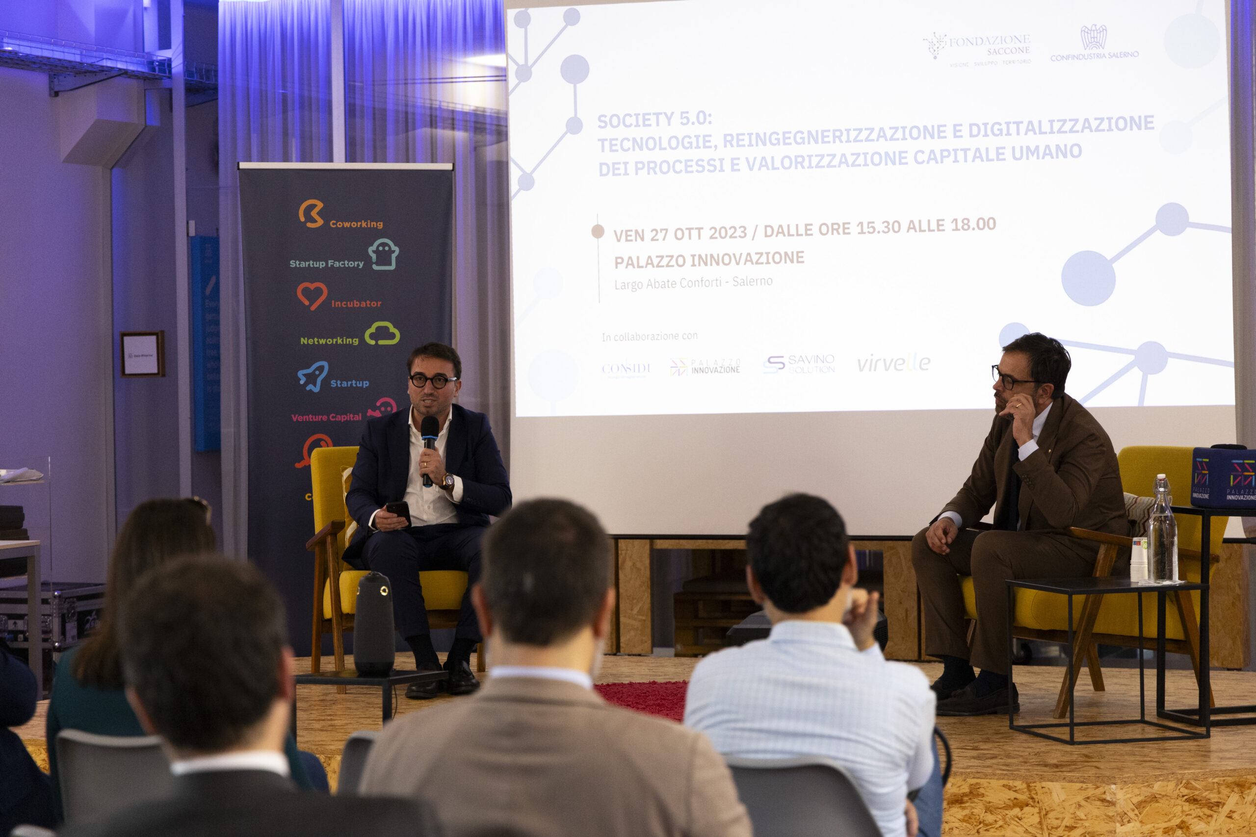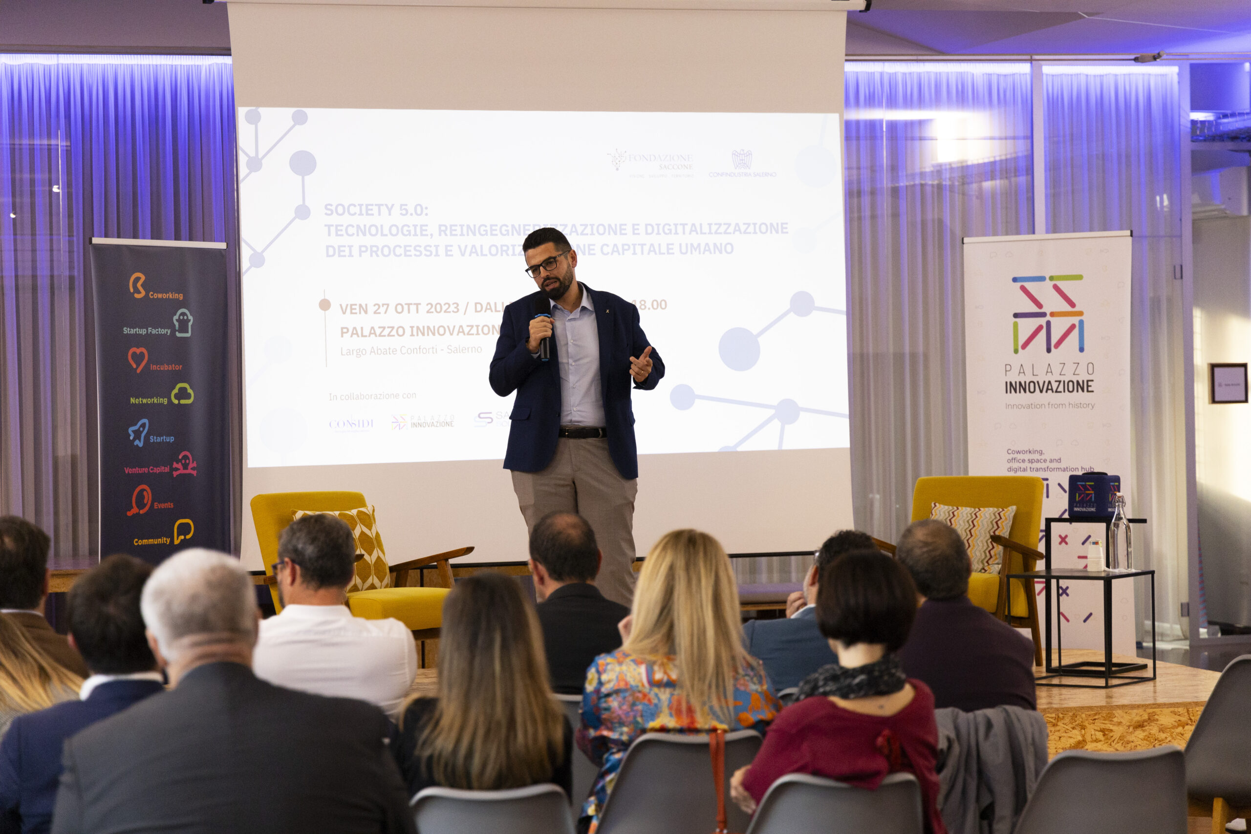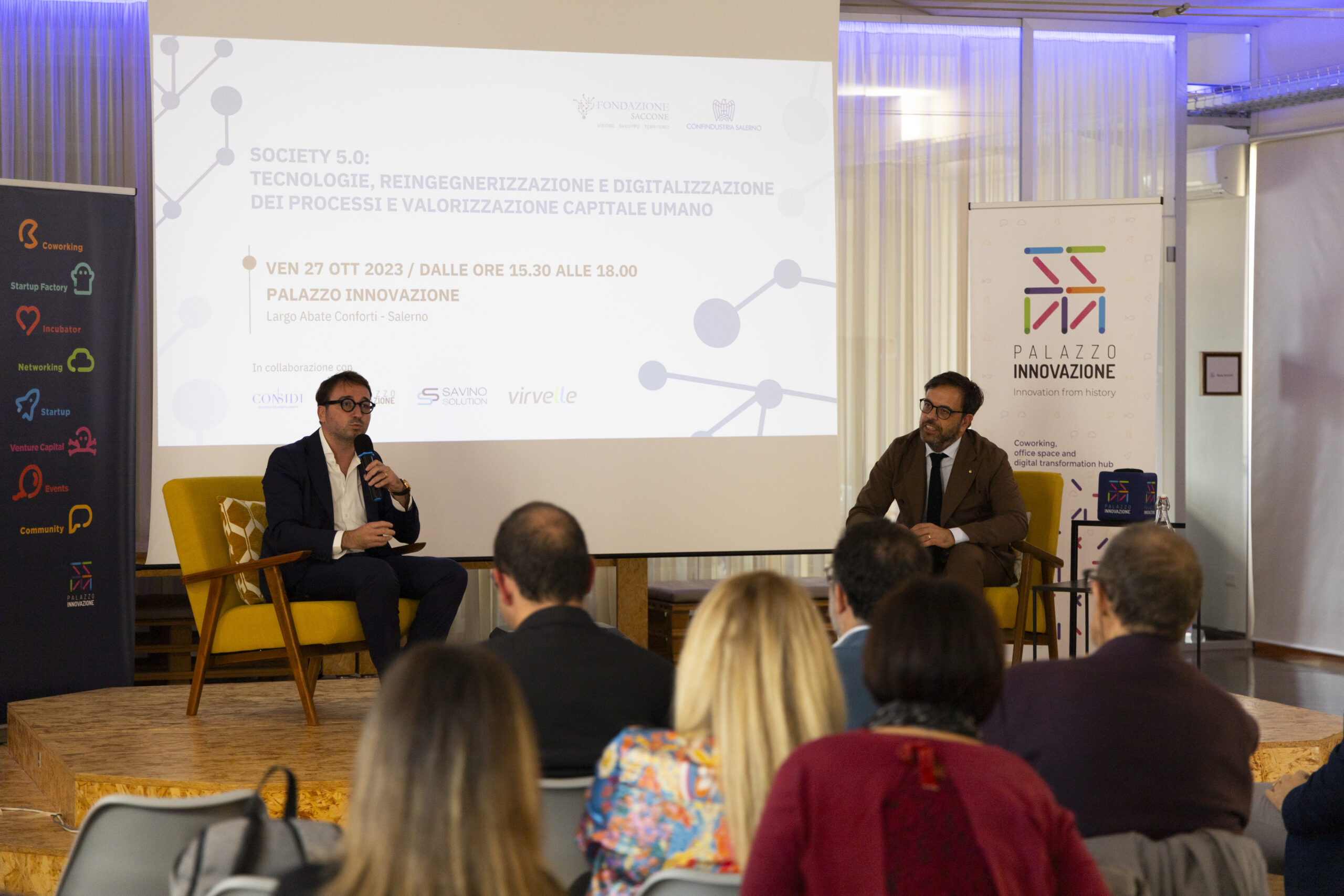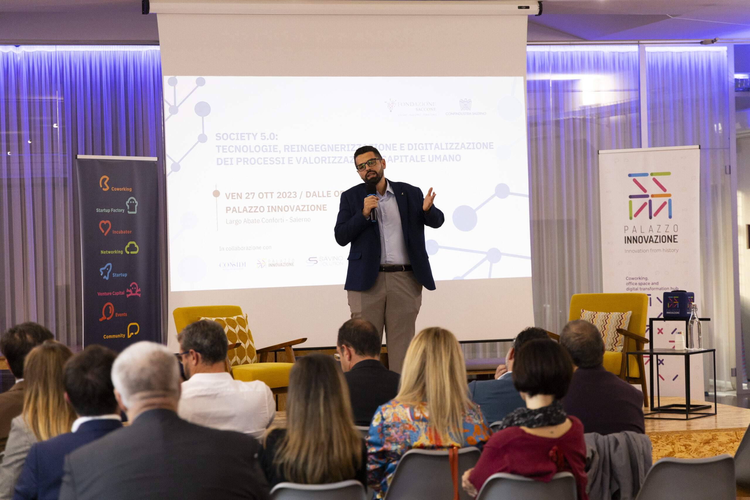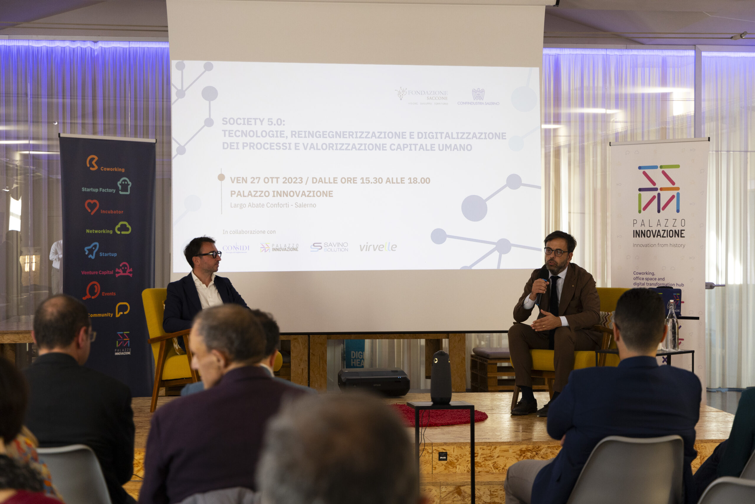 Society 5.0: tecnologie, reingegnerizzazione e digitalizzazione dei processi e valorizzazione capitale umano”. Ecco gli scatti della seconda tappa del Digital Meet 2023, organizzato dalla Fondazione Saccone a Palazzo Innovazione. Un importante momento di confronto con esperti sul tema della digitalizzazione. Sono intervenuti nel corso dell’appuntamento: – Giorgio Scala, Presidente Fondazione Saccone e Responsabile 012Salerno sede territoriale di 012factory; – Edoardo Gisolfi Coordinatore Comitato Tecnico-Scientifico Fondazione Saccone; – Marco Gambardella Vicepresidente Confindustria Salerno con delega alla Digitalizzazione Interventi; – Alessia Saggese Dip. di Ingegneria dell’Informazione ed Elettrica e Matematica Applicata (DIEM); – Nicola Savino – Il Digitalizzatore CEO di Savino Solution SpA Società Benefit; – Mario Vitolo CEO Palazzo Innovazione e General Manager Virvelle; – testimonianza di una buona prassi di Antonio Pallavicino Direttore Operativo CO.ME.P. Srl.